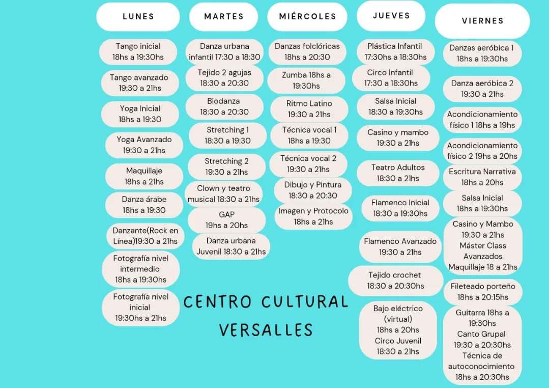 El Centro Cultural Versalles, ubicado en Bruselas 785, ofrece los siguientes talleres. Para inscribirse, hay que dirigirse personalmente de 18 a 20.30hs.