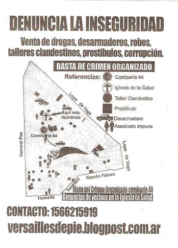 Versailles de pie está conformado por un grupo de vecinos que se ocupan de denunciar la inseguridad, y para eso, hacen entre otras cosas un mapa del crimen organizado en el barrio. Generalmente se reúnen en la Iglesia de La Salud, y tratan, por ejemplo, los temas: venta de drogas, desarmaderos, robos, talleres clandestinos, prostíbulos y corrupción, existentes en la jurisdicción de la comisaría 44°.