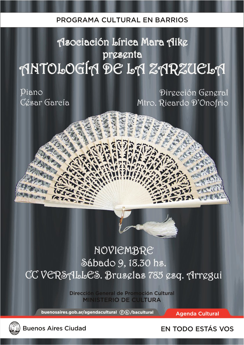 Llega el espectáculo "Antología de zarzuela" de la Asociación Lírica Mara Aike, bajo la dirección general de Ricardo D´onofrio y con César García al piano. El show será este sábado 9, a las 18.30 hs. en la calle Bruselas 785, esquina Arregui. ¡La entrada es libre y gratuita!
