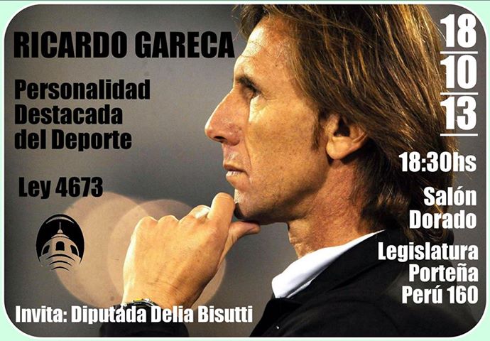 El miércoles 23, a las 18 hs comenzará el acto en el que el futbolista recibirá la mención. Mediante una iniciativa de la diputada porteña Delia Bisutti, el actuál técnico de Vélez Sarsfield fue declarado Personalidad Destacada del Deporte. El acto se iba a concretar el viernes 18, pero con motivo del enfrentamiento entre el fortín y Racing en Avellaneda, se le hacía imposible a Gareca ir a recibir el diploma a la legislatura, por eso se reprogramó el evento que finalmente se realizará este miércoles.