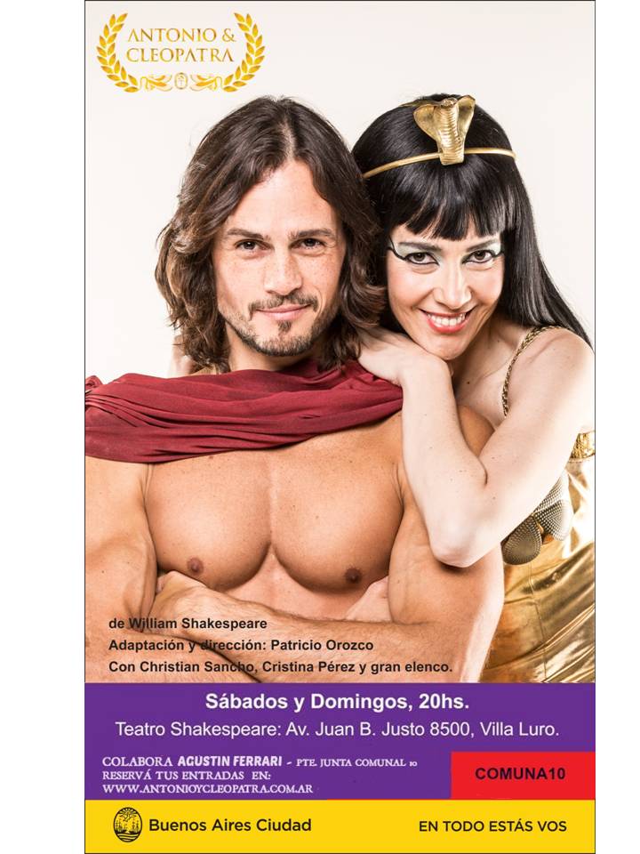 El sábado 21, a las 20, iniciará sus actividades en Villa Luro, más precisamente en Avenida Juan B. Justo 8500, el teatro Shakespeare con la obra Antonio y Cleopatra, dirigida por Patricio Orozco e interpretada por un elenco que encabezan Cristian Sancho y Cristina Pérez.